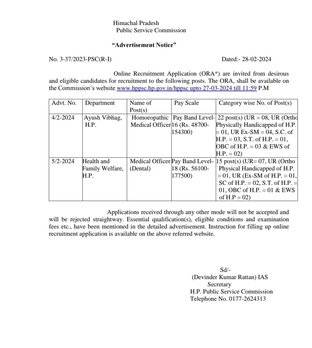 हिमाचल प्रदेश लोक सेवा आयोग ने इसके लिए अधिसुचनाा जारी कर दी है। इन पदों के लिए 27 मार्च 2024 तक ऑनलाइन आवेदन किए जा सकते हैं।
